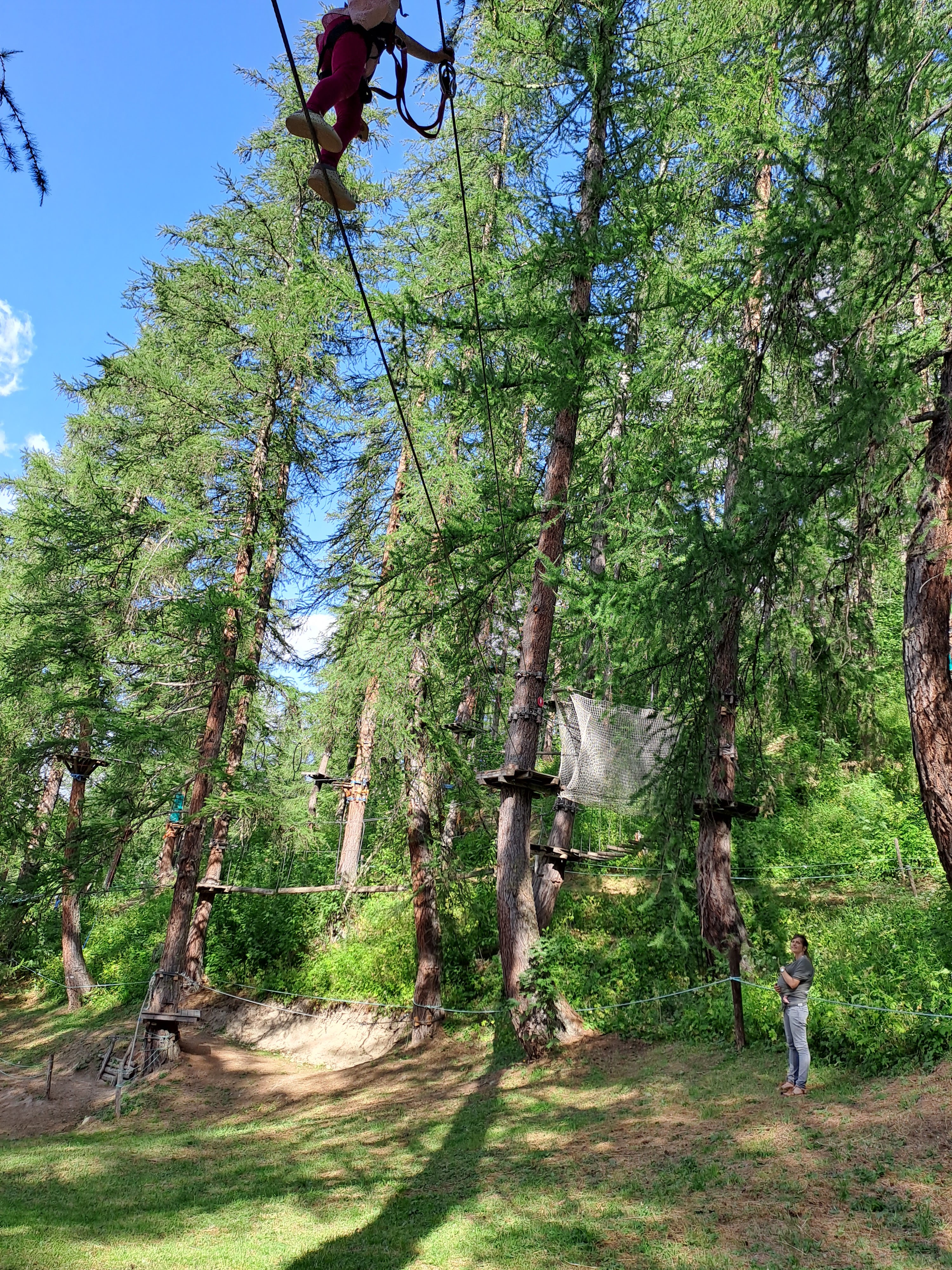 Après midi en famille. Parcours adaptés qu'on peut suivre du bas. Le matériel est hyper sécurisant (boucle magnétique qui fait qu'on est toujours assuré).Personnel disponible et attentif à ce qui se déroule sur tous les parcours; qui partage son goût pour la nature et la forêt.