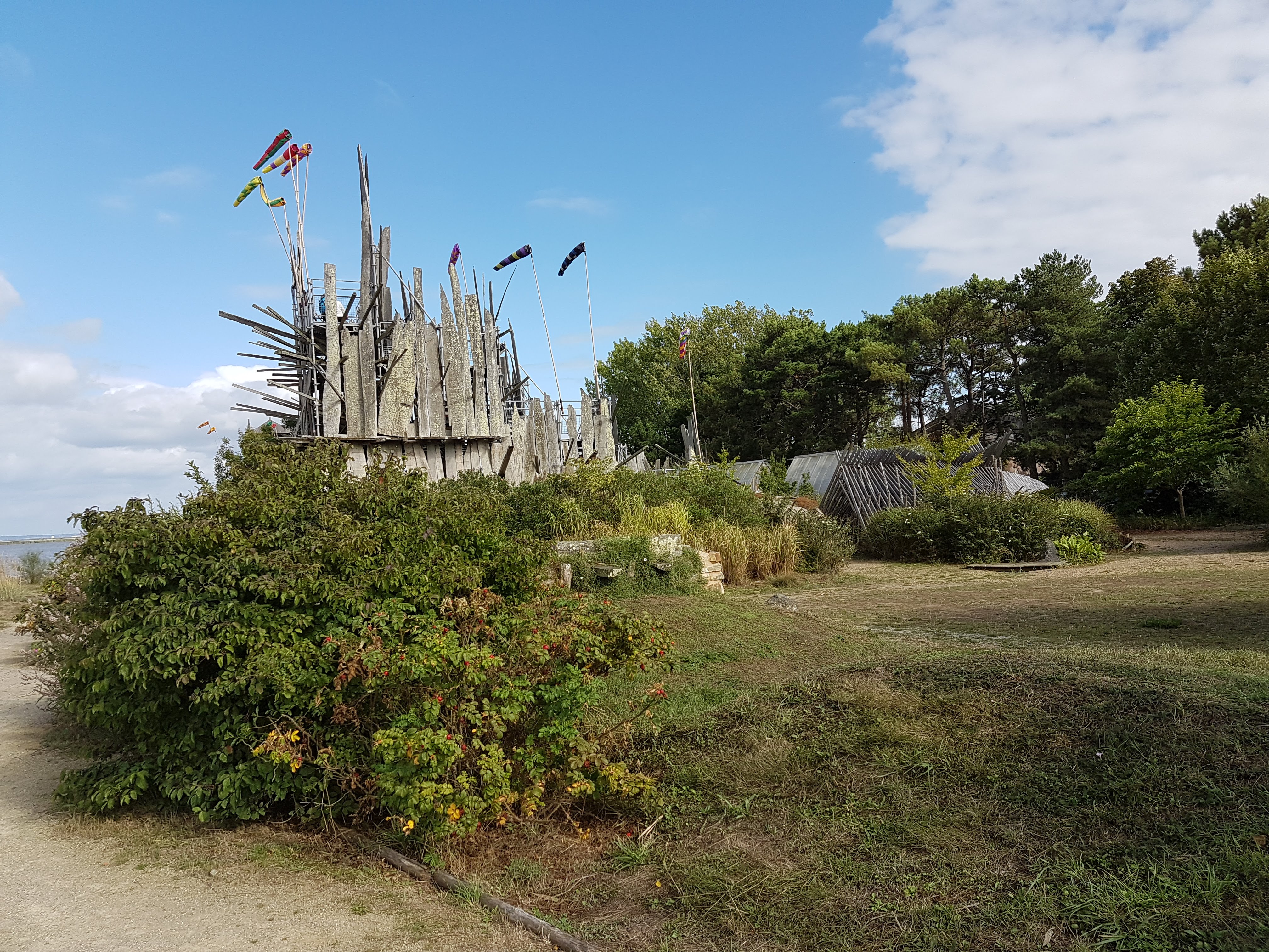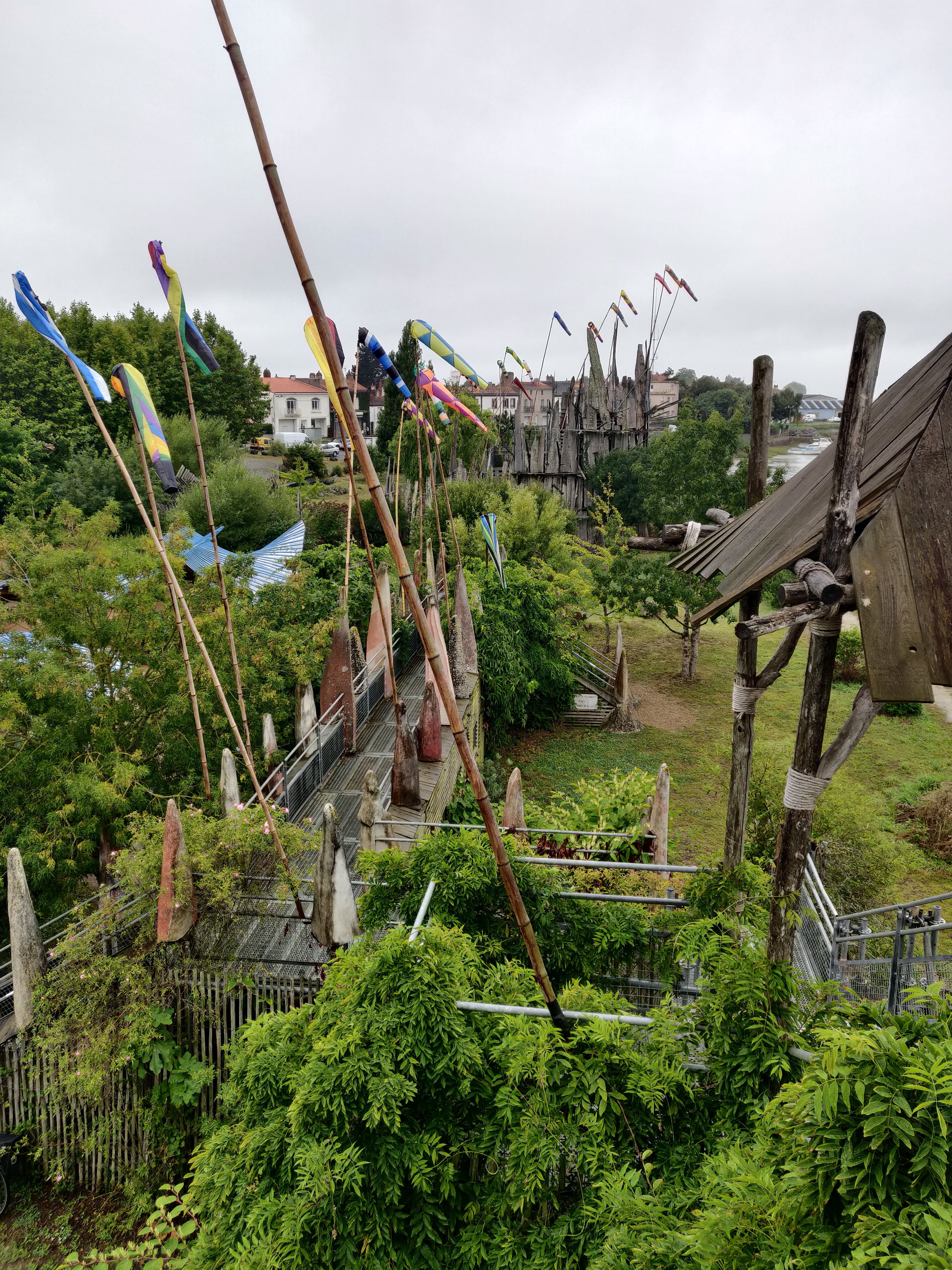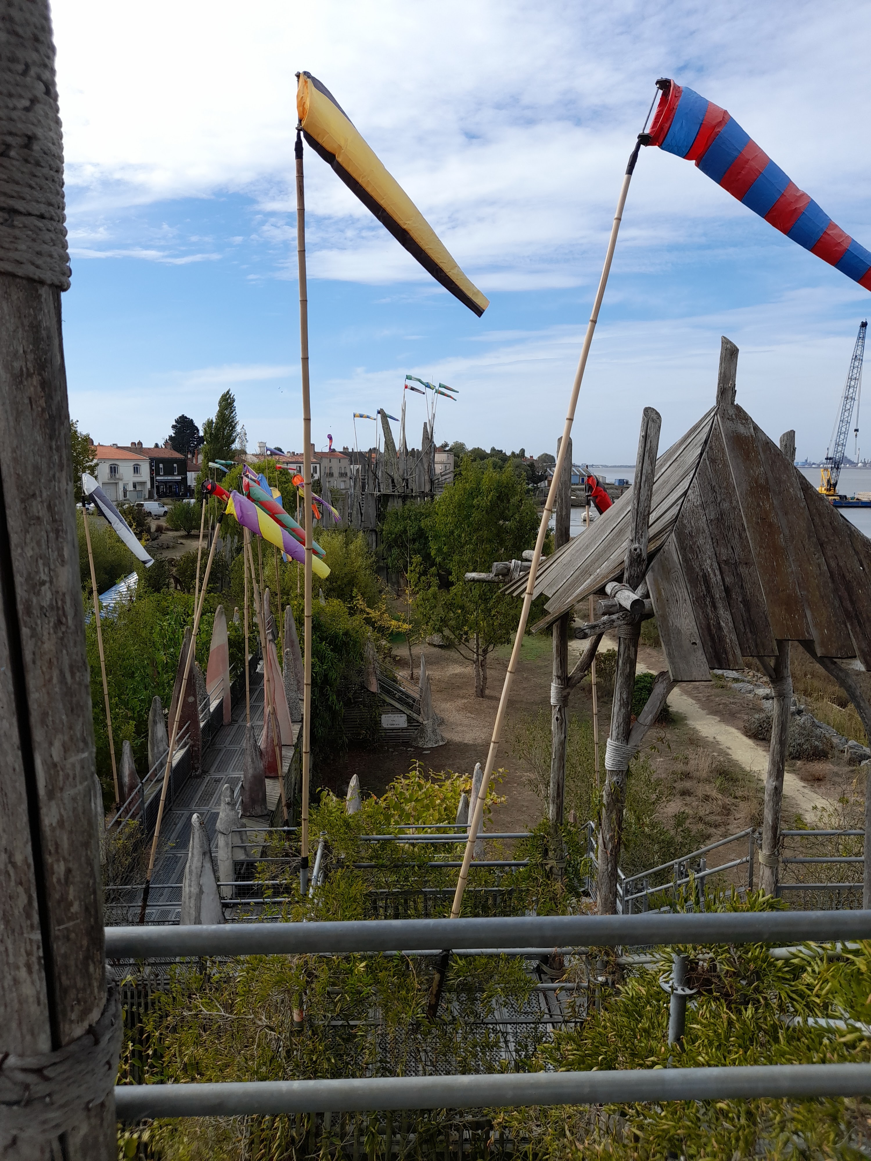 Très très sympa d'avoir fait ce petit jardin avec les bois récupérés de la grande inondation vendéenne ! Dommage que le temps était maussade car avec un beau ciel clair et bleu, voir voler ces drapeaux multicolores au gré des vents de Loire aurait été splendide mais malgré ca j'ai adorée, c'est à faire dans le parcours des curiosités de l'estuaire de la Loire à découvrir 😉
