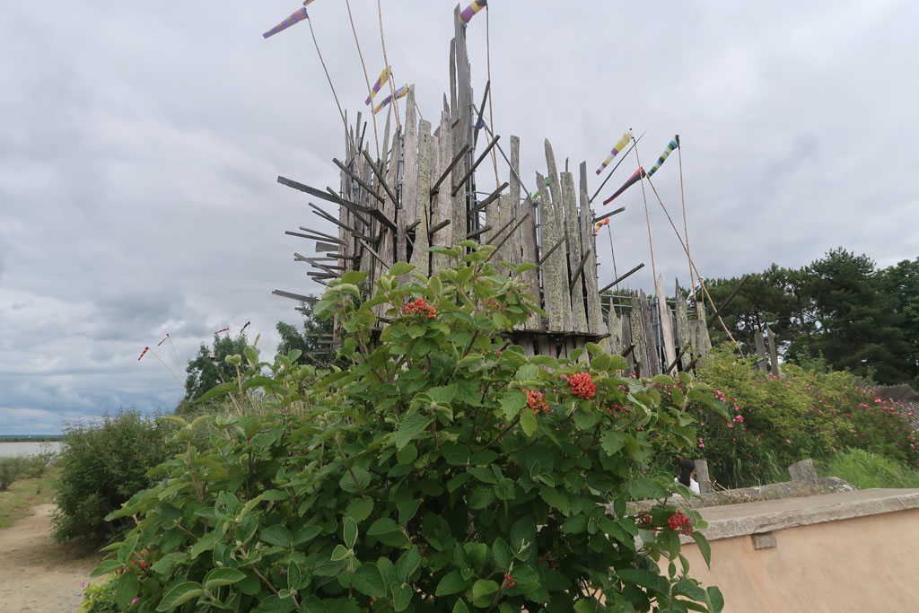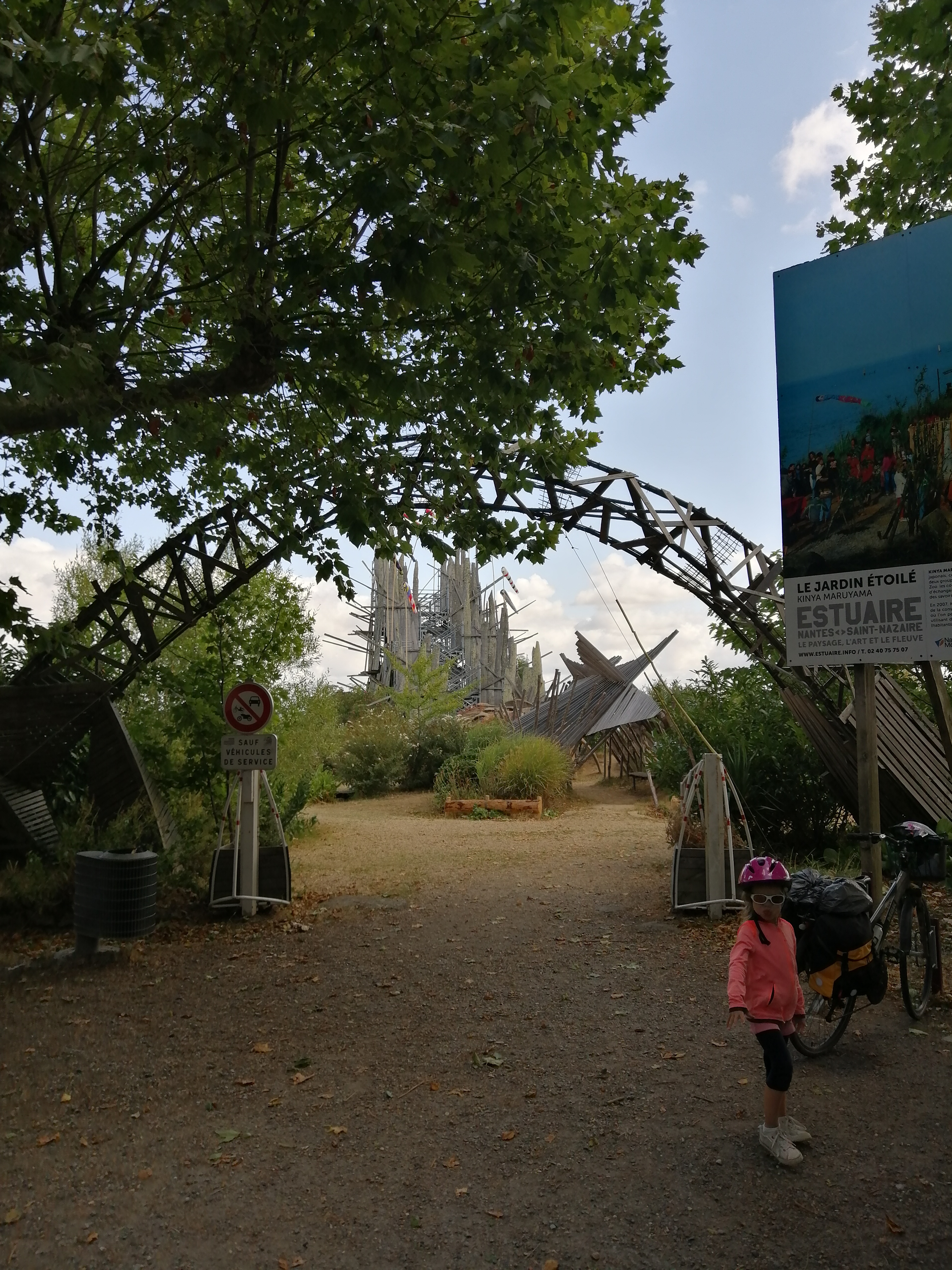 Surprenant et spectaculaire; Venant de la route de Paimboeuf, l'ensemble est en partie masqué par les arbres, seuls dépassent en hauteur, des pieux, des piques. En m'approchant j'ai l'impression d'une forteresse à l'aspect guerrier sortie des films de samourai . En fait il s'agit d'une oeuvre du parcours de l'Estuaire sous l'égide de la ville de Nantes et je ne suis pas étonnée d'apprendre que le créateur est Japonais ; il a dû s'inspirer également de l'environnement tels les pieux qui dépassent des rives de la Loire et qui complètent bien l'ensemble. Site extrêmement vivant: enfants et adultes s'en accaparent: on le gravit, l'escalade, on y joue et du haut des terrasses on admire la Loire et les gigantesques raffineries sur l'autre rive. L'accès est totalement libre, et ouvert en permanence. Un petit parking à proximité et un lieu pour pique niquer. Seul manque un panneau explicatif.