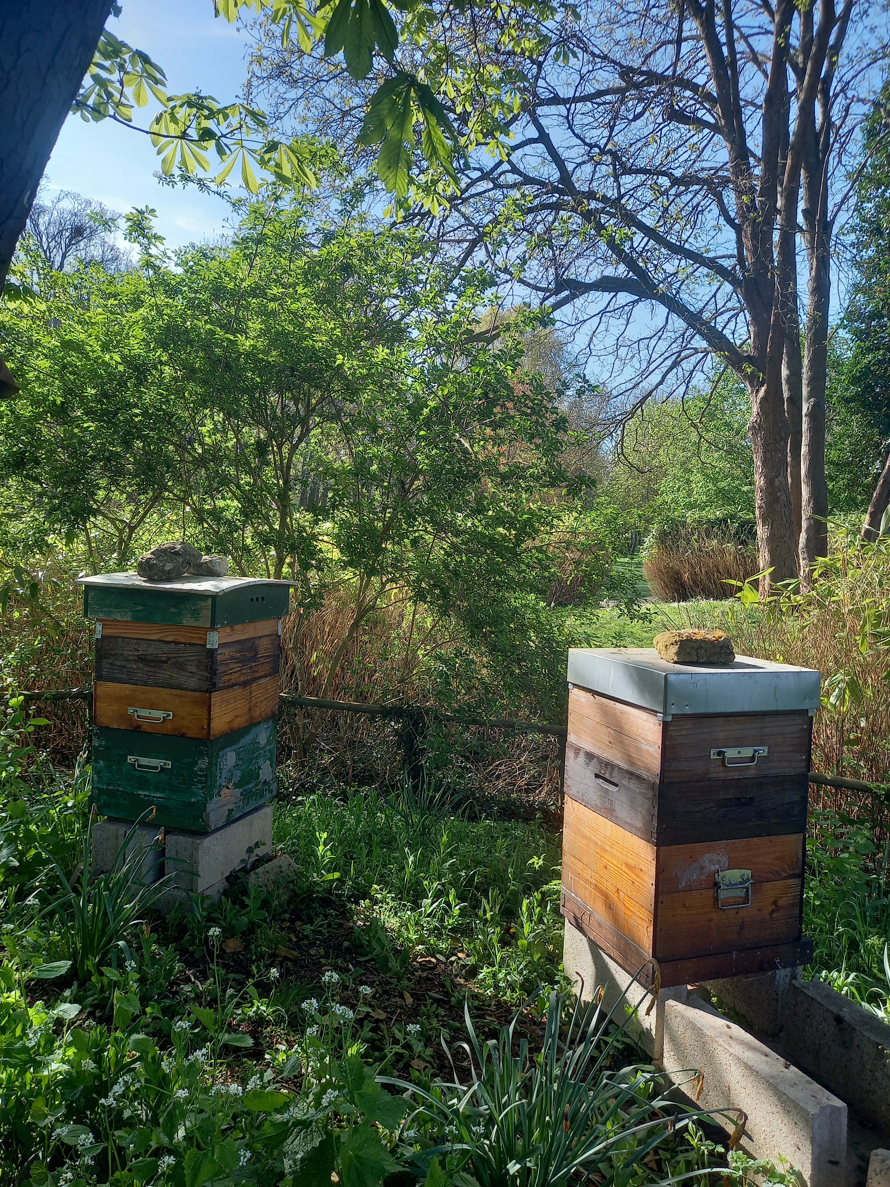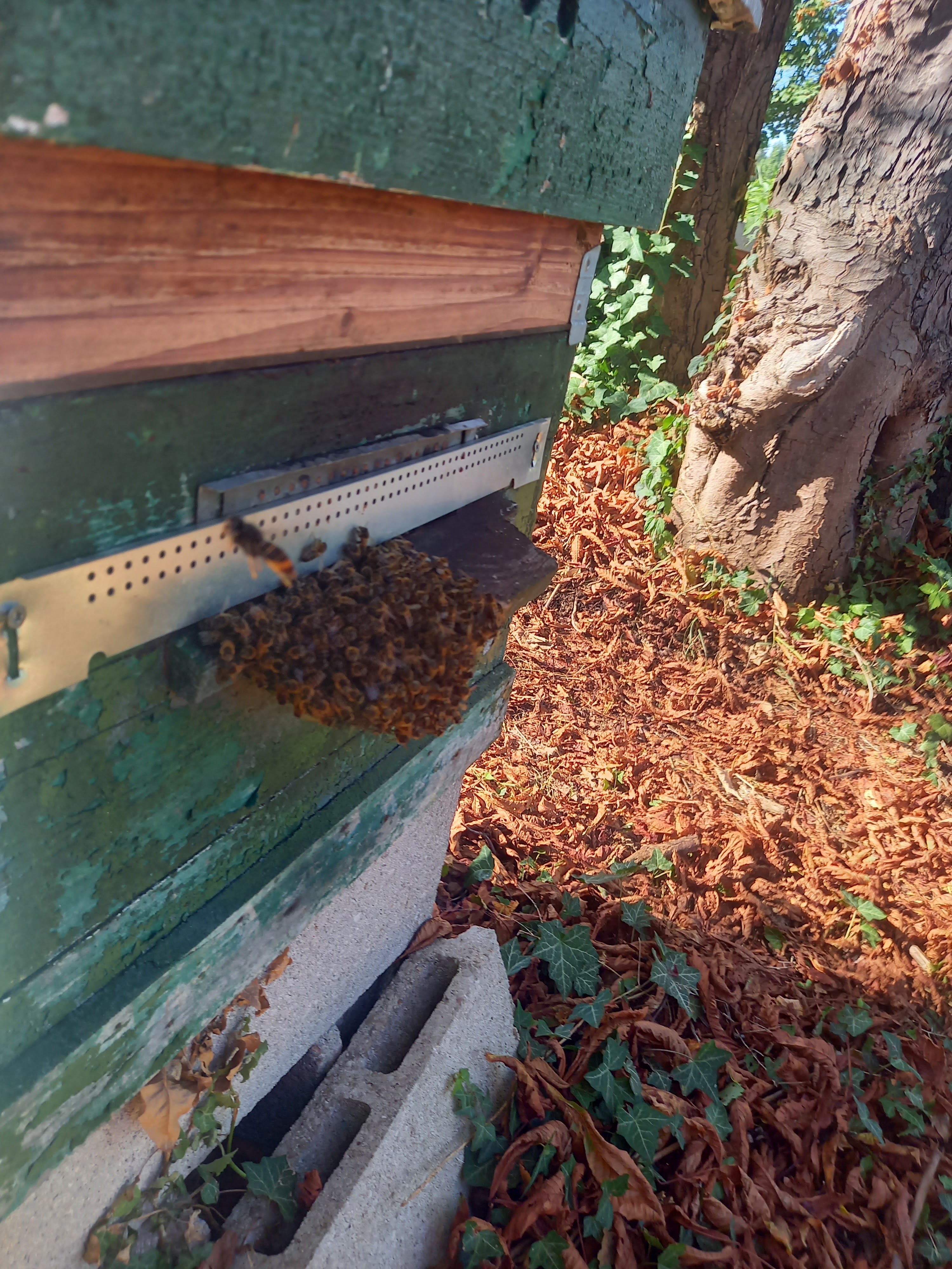 En cette saison, les ruches sont confrontées aux frelons asiatiques. Elles forment des grappes d'abeilles devant l'entrée pour se défendre. Si un frelon s'approche trop elles l'attrapent, le recouvrent et l'étouffent en quelques minutes. Un frelon attrape entre 30 et 50 abeilles par jour pour nourrir ses larves. Les abeilles du parc ont produit du miel au printemps et en été cette année. Vous pouvez l'obtenir auprès de l'apiculteur, son téléphone est sur la clôture.