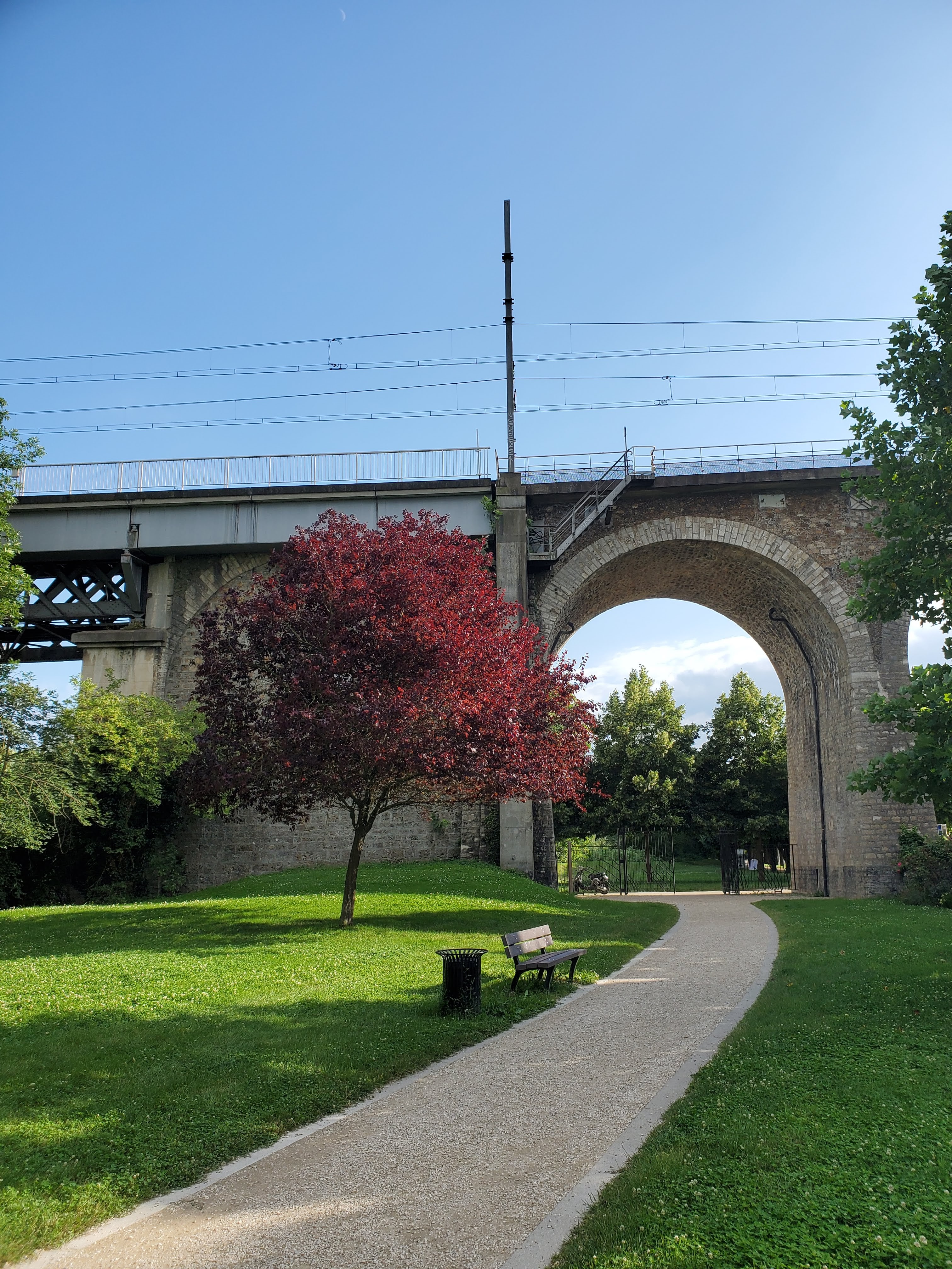 Grand parc sympa , beau parking ,des jeux pour les enfants .bruit avec LE RER qui passe sur le pont en féroce qui fait que cela résonne. Beaucoup de banc ,très bien la semaine ,car le week-end CELA doit être infernal .