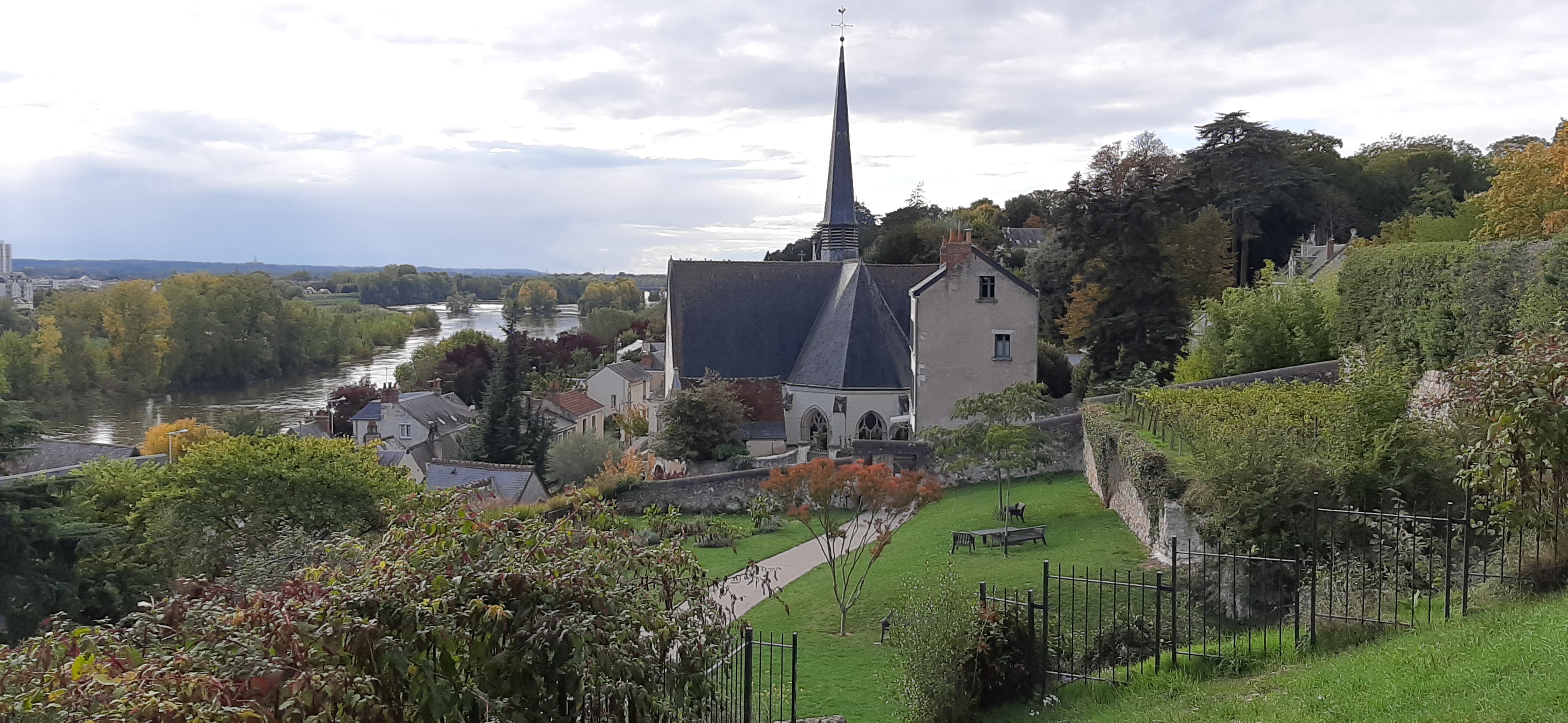 La vue sur la Loire est assez magnifique, une église en contrebas, sur le fleuve se reflètent la végétation (abondante) et le ciel. C'est en encore plus sublime quand le soleil se couche en été puisque la vue est orientée vers l'ouest. Un sol habituellement recouvert de cyclamens en automne (il y en a moins cette année), des corbeaux, des paons, et si vous êtes chanceux, des écureuils... Parfait pour un pique nique en famille ou une balade, pour peu que croiser du monde ne soit pas un problème.
